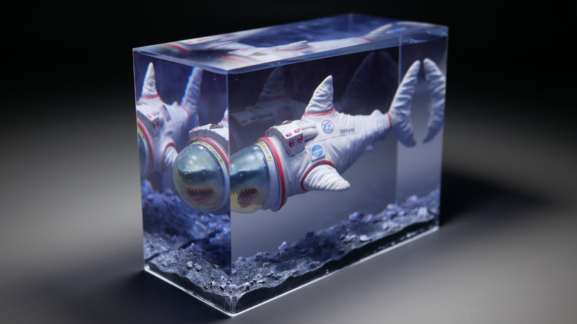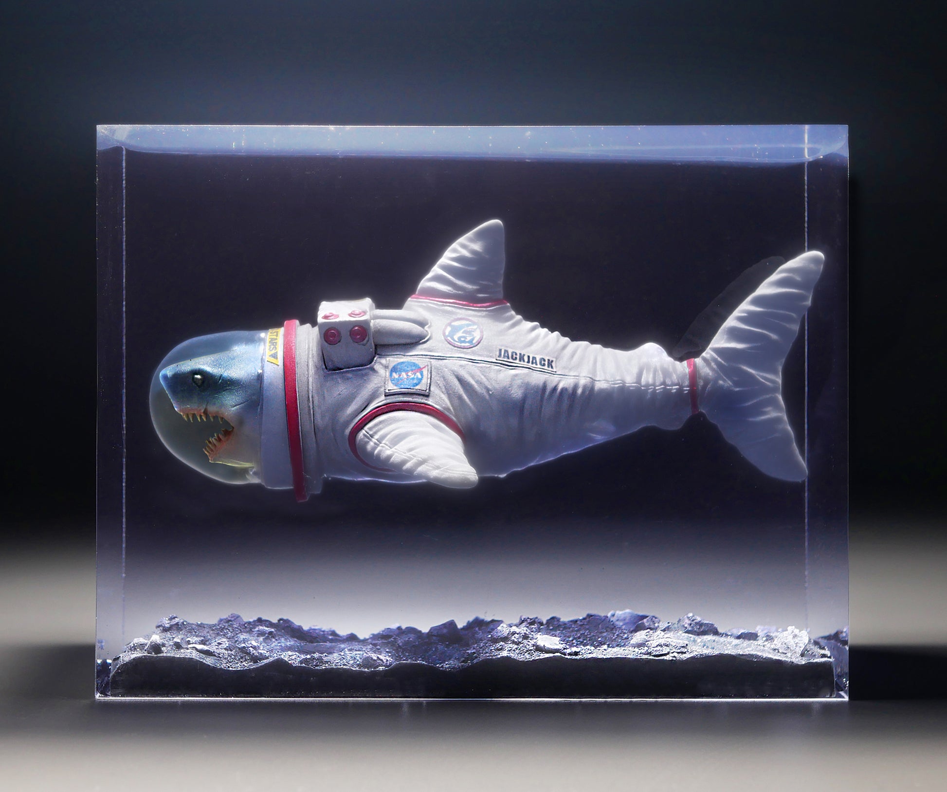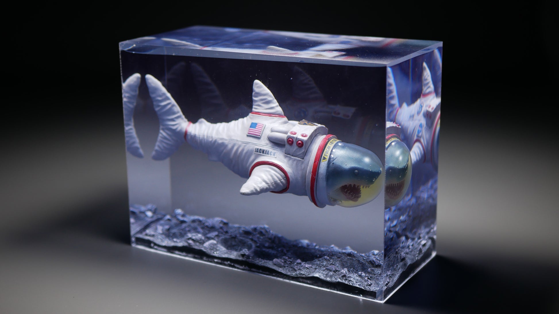 A limited edition resin artwork capturing the surreal moment of a shark drifting through space above the moon